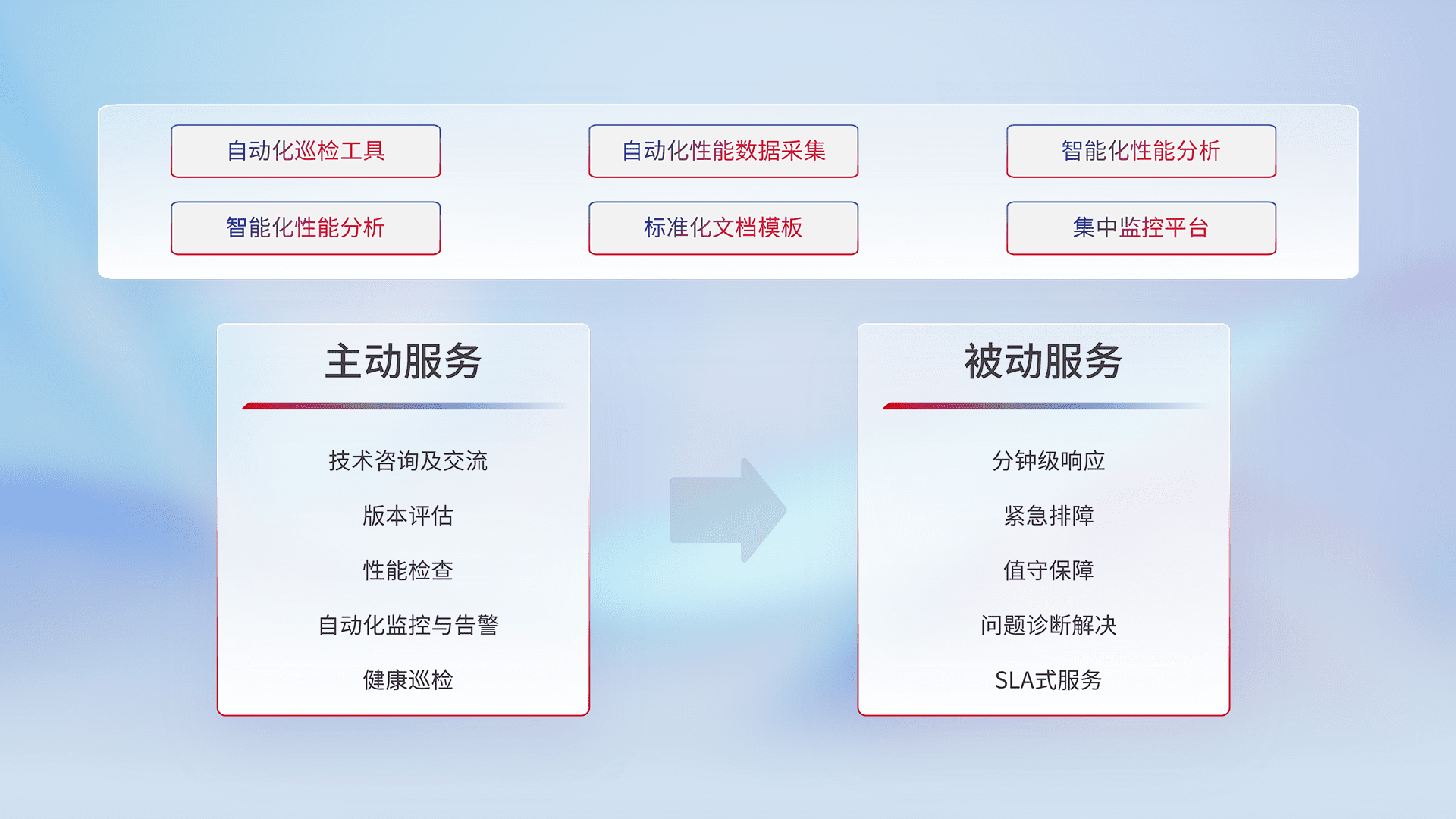 智能化工具和标准化文档,,,保障服务质量,,,提供主动服务(包含技术咨询、、版本评估、、性能检查、、自动化监控与告警、、、、健康巡检)和被动服务包含(分钟级响应、、、紧急排障、、、值守保障、、、问题诊断解决、、SLA服务)。。。。